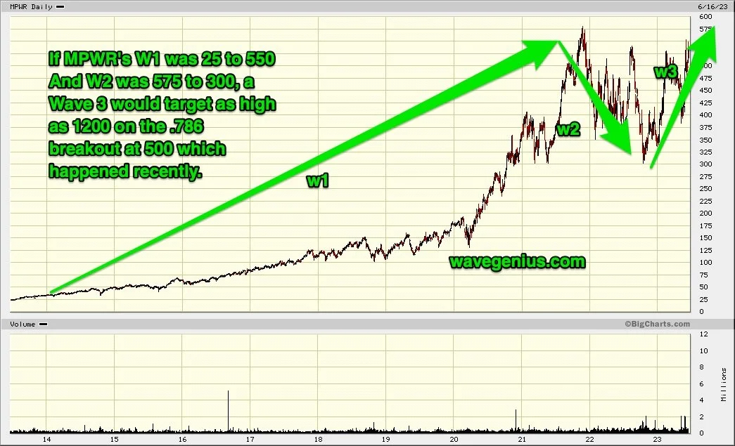 Ted Aguhob has applied the Elliott Wave Theory to MPWR's past performance to predict its future trajectory. According to him, the .786 breakout level on the current Wave 3 for MPWR was 500. This breakout level was decisively overcome, setting the stage for a potentially significant Wave 3.